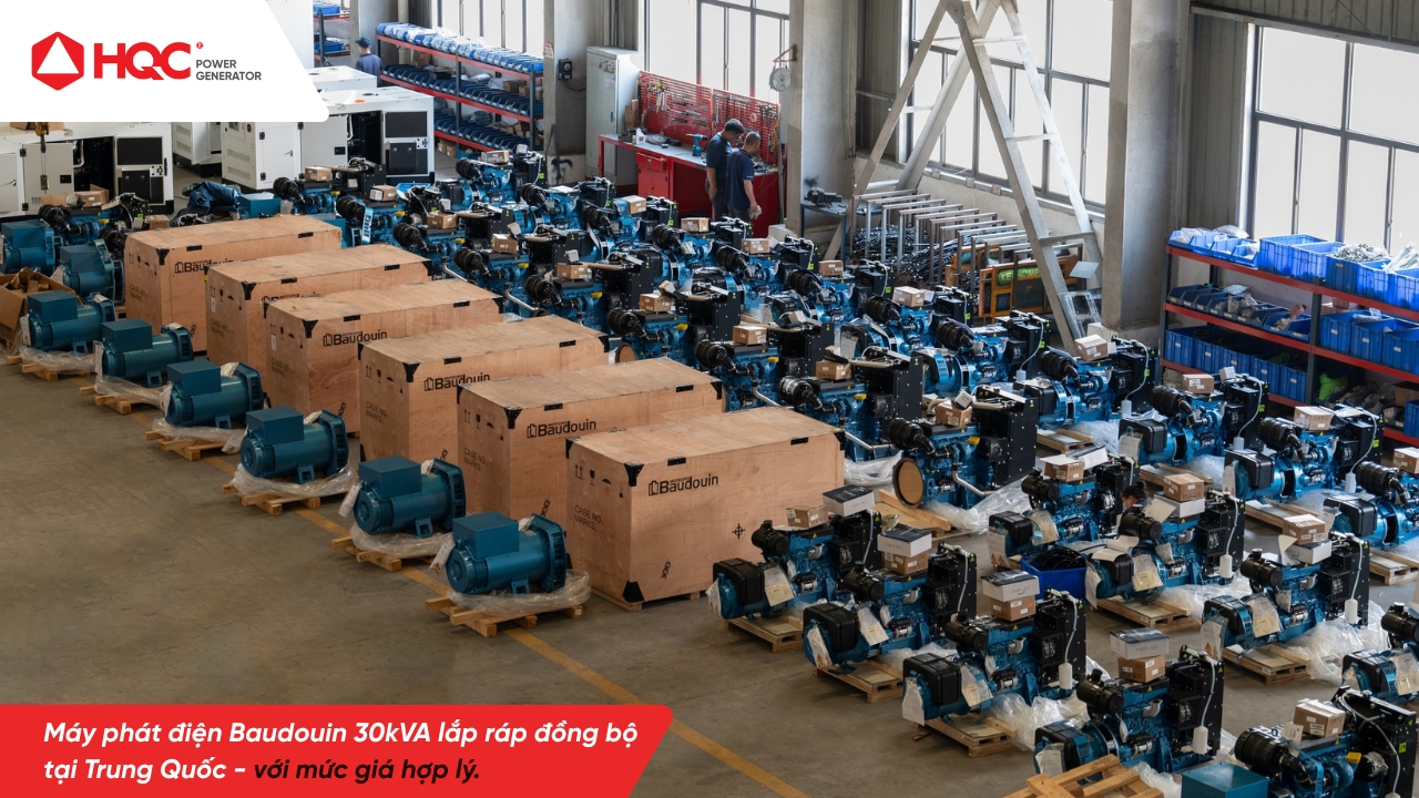 Máy phát điện Baudouin 30kVA nhập khẩu nguyên chiếc từ Trung Quốc, lắp ráp theo tiêu chuẩn châu Âu (CE Certificate) với 100% thiết bị được sản xuất bởi các thương hiệu G7: động cơ Baudouin (Pháp), đầu phát Leroy Somer (Pháp) và bộ điều khiển Deepsea (Anh Quốc).