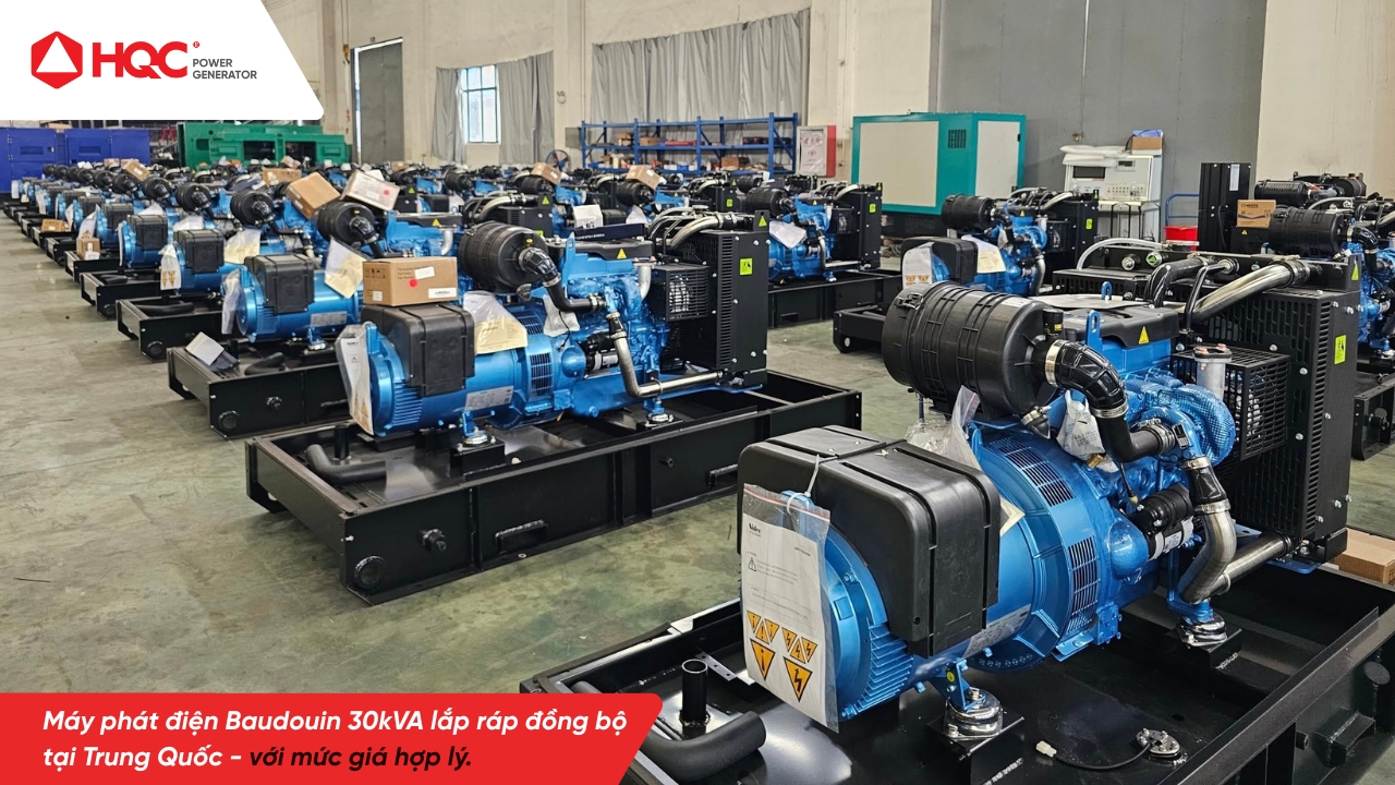 Máy phát điện Baudouin 30kVA nhập khẩu nguyên chiếc từ Trung Quốc, lắp ráp theo tiêu chuẩn châu Âu (CE Certificate) với 100% thiết bị được sản xuất bởi các thương hiệu G7: động cơ Baudouin (Pháp), đầu phát Leroy Somer (Pháp) và bộ điều khiển Deepsea (Anh Quốc).